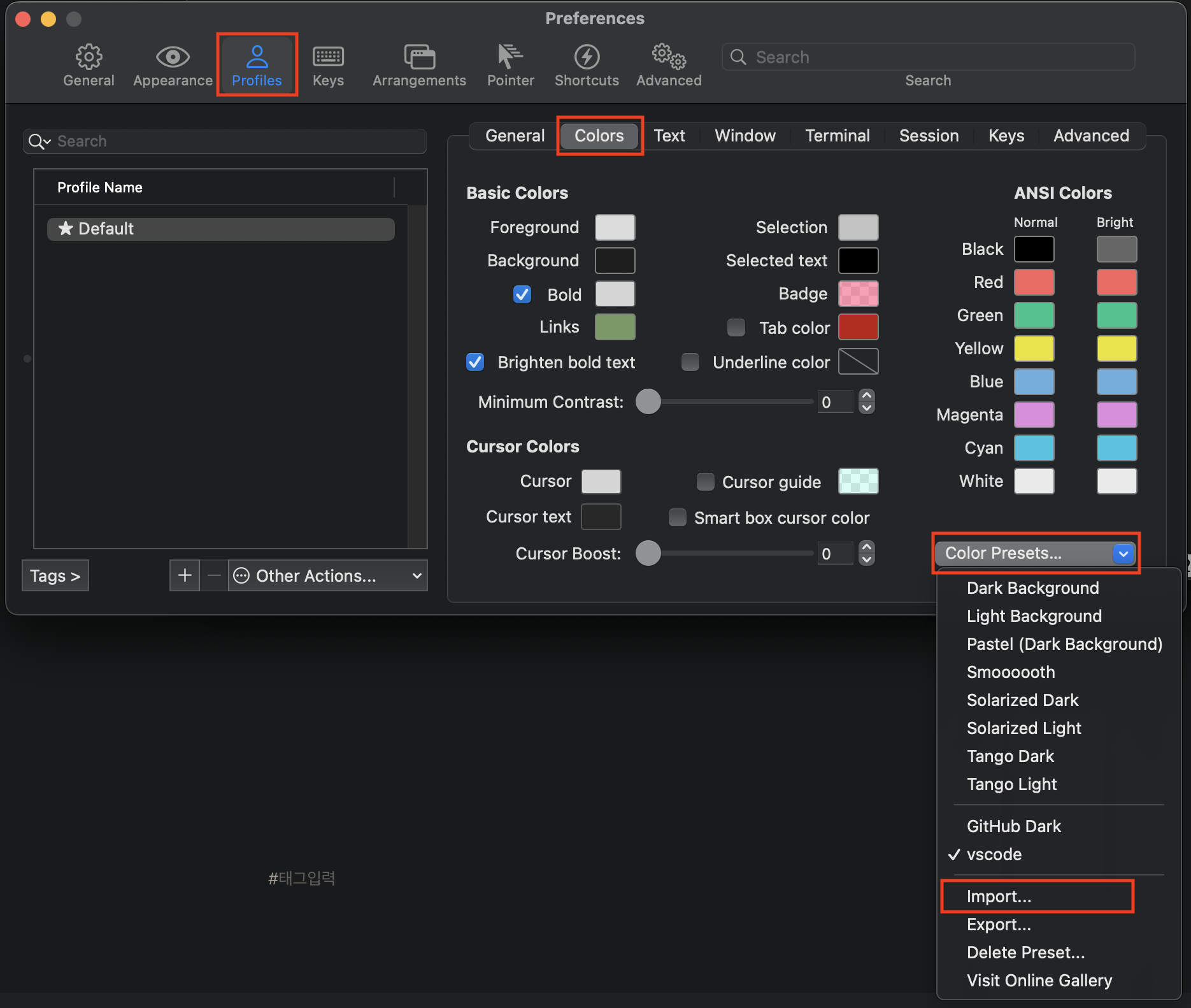 GitHub Dark Default.itermcolors0.01MBGitHub Dark Dimmed.itermcolors0.01MBGitHub Dark High Contrast.itermcolors0.01MBGitHub Light Default.itermcolors0.01MBvscode-light.itermcolors0.01MBvscode.itermcolors0.01MB원하는 theme를 다운받은 후 iterm의 preferences를 켠다.