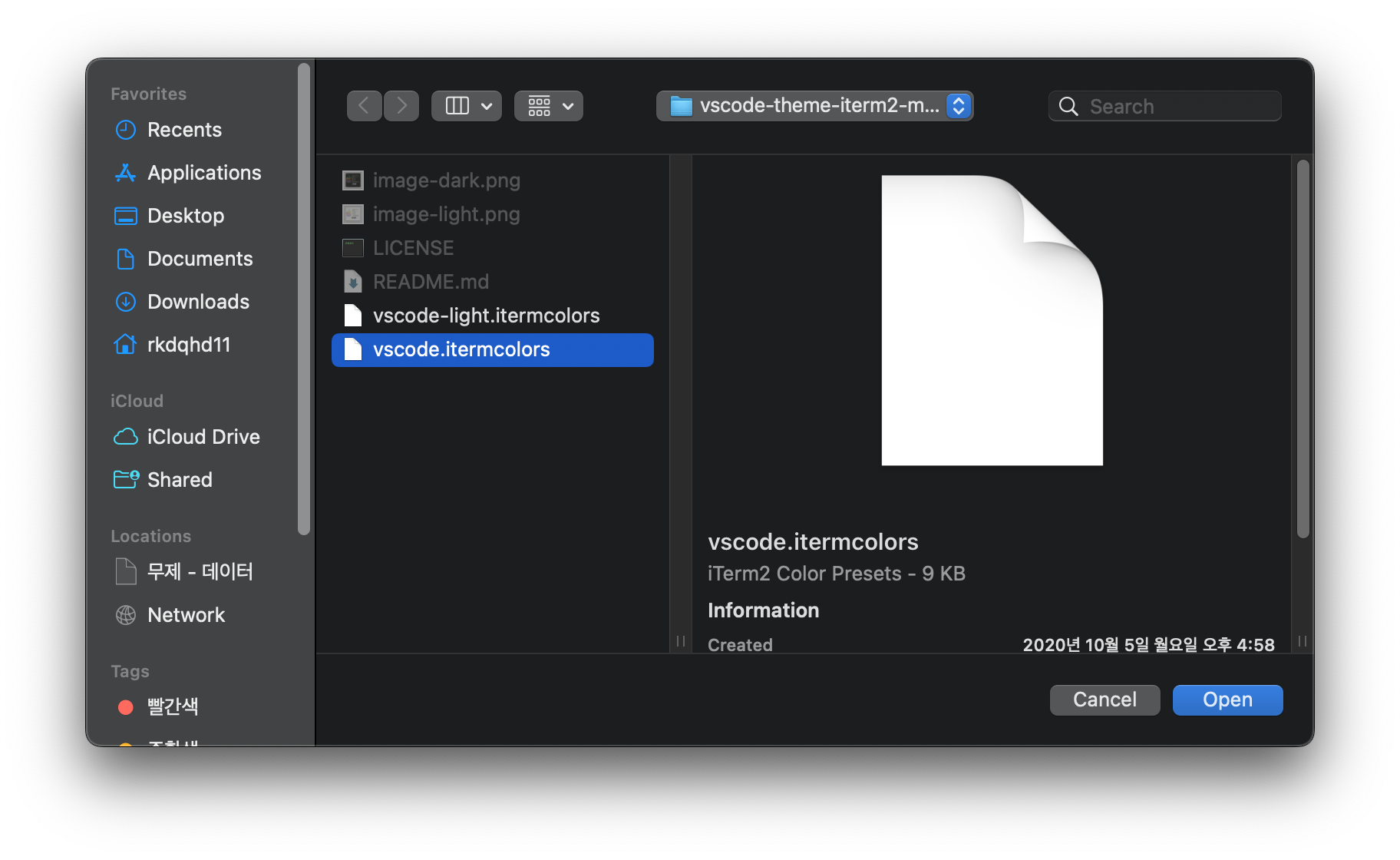 확장자는 필히 ".itermcolors" 로 되어있어야 한다.