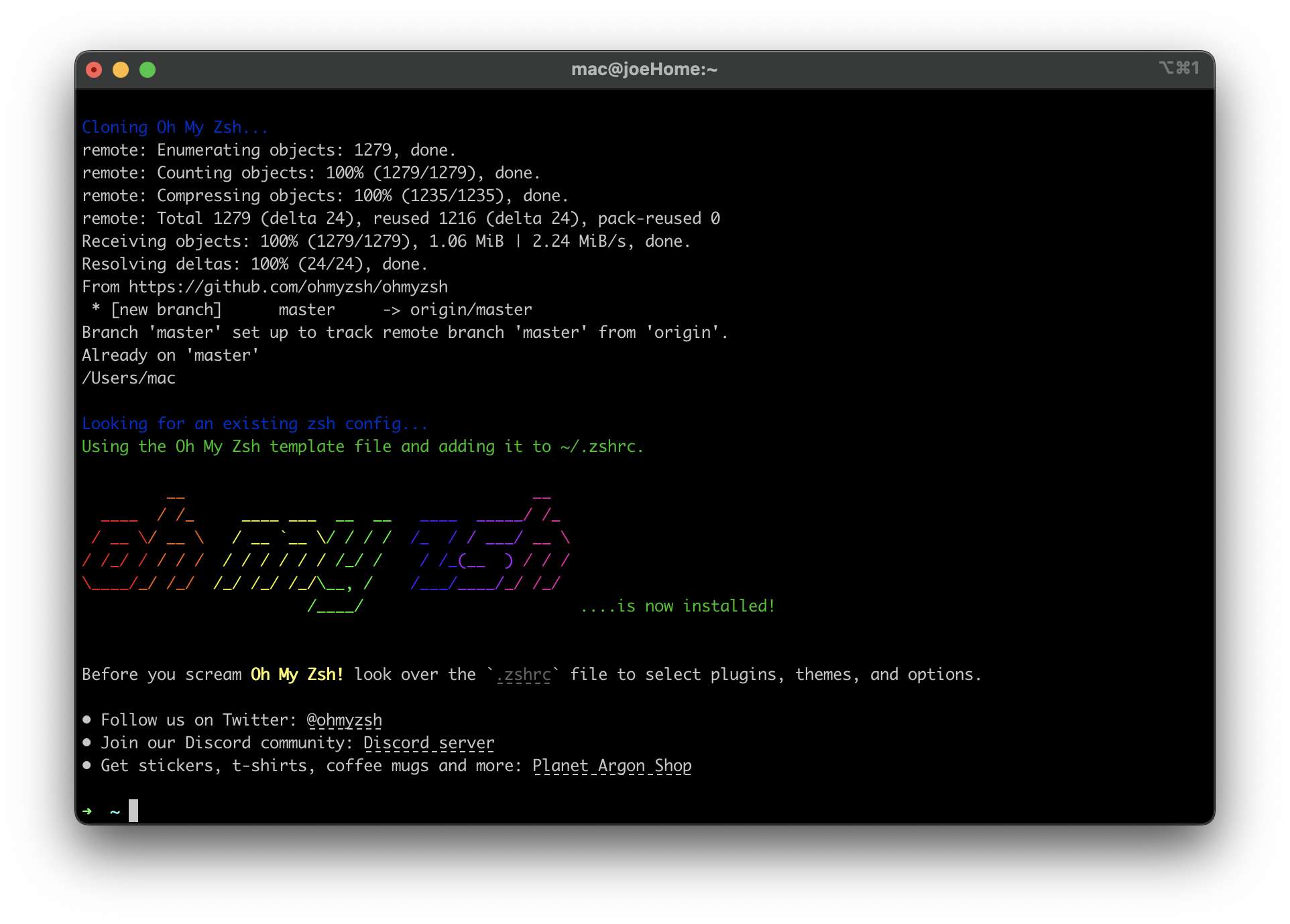 oh my zsh 설치 완료 위와 같은 창이 나오면 설치 완료