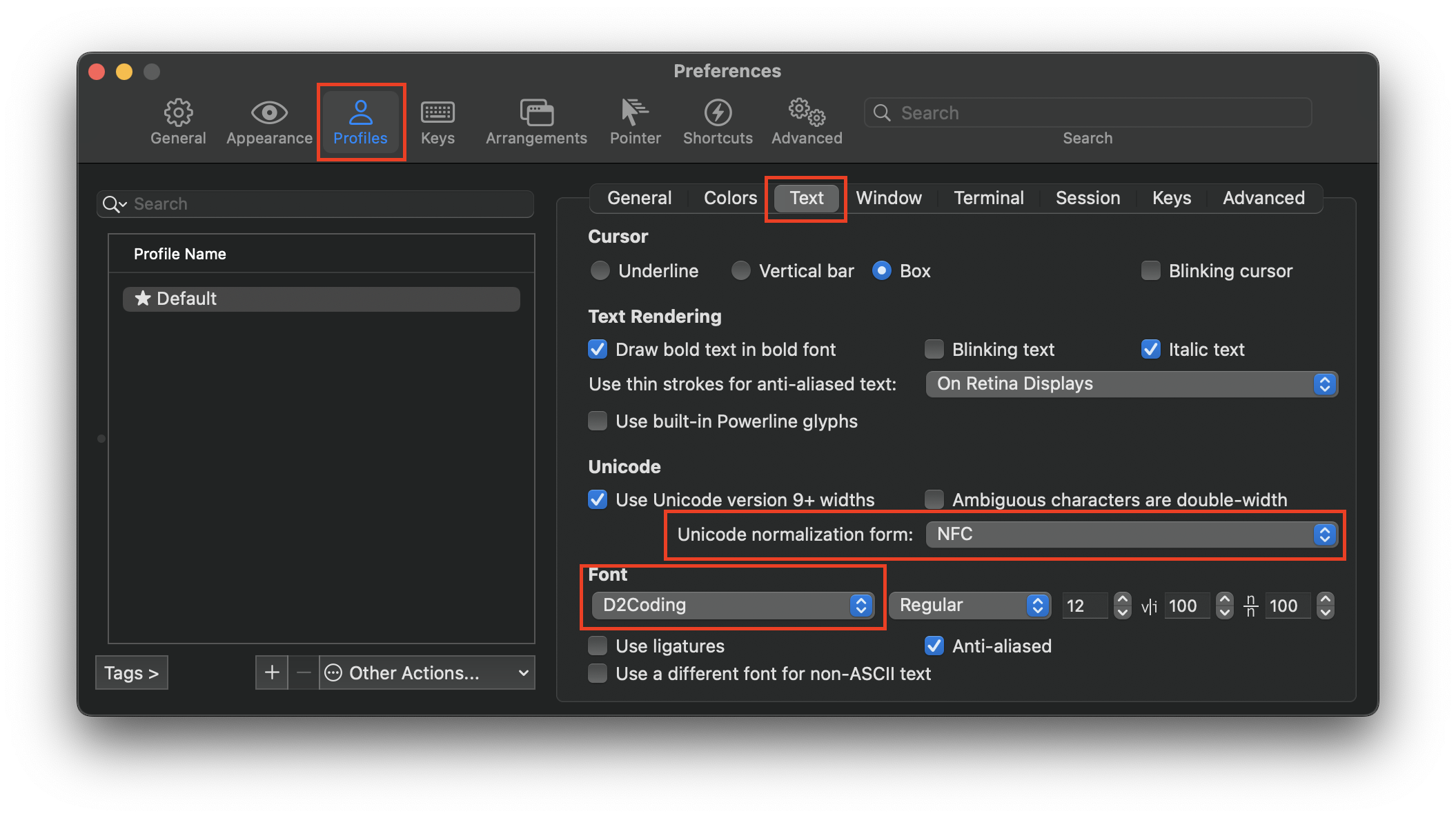 Perferences -> Profiles -> Text 에서 하단의 "Font"와 "Unicode normalization form" 을 수정해야한다.