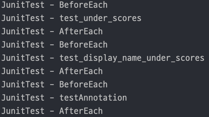 @Slf4j @DisplayNameGeneration(DisplayNameGenerator.ReplaceUnderscores.class) class JunitTest { @BeforeEach void testBeforeEach() { log.info("BeforeEach"); } @AfterEach void testAfterEach() { log.info("AfterEach"); } @DisplayName("출력되는 테스트 명을 입력한다.") @Test void testAnnotation() { log.info("testAnnotation"); assertEquals("test","test"); } @Test void test_under_scores() { log.info("test_under_scores"); assertEquals("test","test"); } @DisplayName("출력되는_테스트_명을_입력한다.") @Test void test_display_name_under_scores() { log.info("test_display_name_under_scores"); assertEquals("test","test"); } }