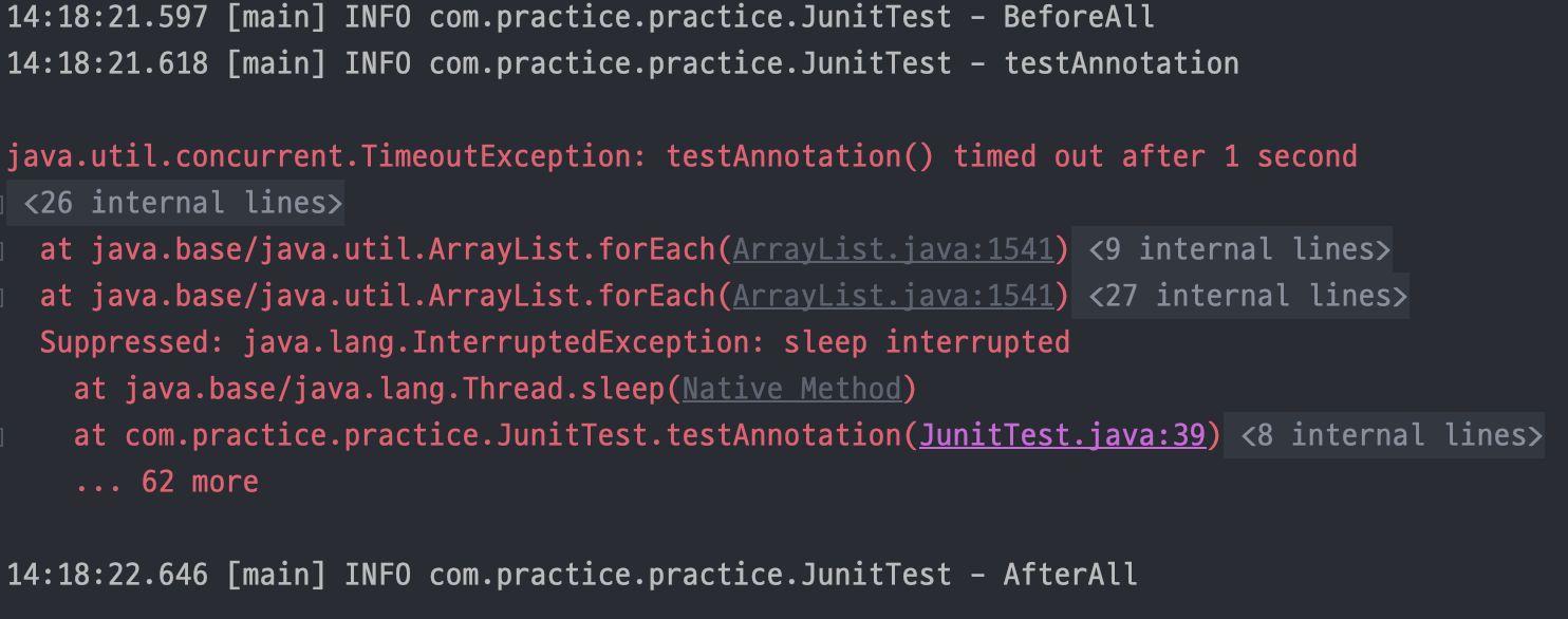 값 설정 42 @Timeout(42) 42 ns @Timeout(value = 42, unit = NANOSECONDS) 42 μs @Timeout(value = 42, unit = MICROSECONDS) 42 ms @Timeout(value = 42, unit = MILLISECONDS) 42 s @Timeout(value = 42, unit = SECONDS) 42 m @Timeout(value = 42, unit = MINUTES) 42 h @Timeout(value = 42, unit = HOURS) 42 d @Timeout(value = 42, unit = DAYS) @Slf4j @DisplayNameGeneration(DisplayNameGenerator.ReplaceUnderscores.class) class JunitTest { @BeforeAll static void testBeforeAll() { log.info("BeforeAll"); } @AfterAll static void testAfterAll() { log.info("AfterAll"); } @DisplayName("출력되는 테스트 명을 입력한다.") @Timeout(1) @Test void testAnnotation() throws InterruptedException { log.info("testAnnotation"); assertEquals("test","test"); Thread.sleep(2000); } }